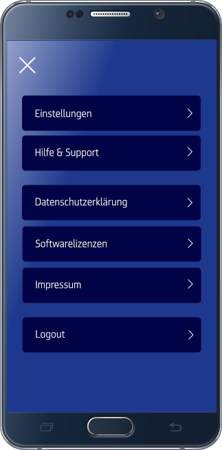 Im App-Menü findet der Nutzer die globalen App-Einstellungen, die Datenschutzerklärung und Kontakte, um den Support zu erreichen. In den App-Einstellungen kann außerdem zwischen dem Dark- und dem Light-App-Layout gewechselt werden, womit die Hintergrundfarbe wahlweise in blau oder weiß eingestellt werden kann. Auch das automatische Schreiben von Log-Files kann im Einstellungsmenü der App deaktiviert werden. Über den Button „Log out“ kann sich der Nutzer aus der App ausloggen.