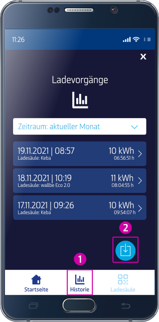 Auf der Übersichtsseite für vergangene Ladevorgänge (1), kann der Nutzer die Einträge für unterschiedliche Zeitabschnitte filtern. Mit einem Klick auf einen Eintrag können weitere Details des Ladevorgangs angezeigt werden. Über den Downloadbutton (2) können Ladevorgänge im definierten Zeitraum heruntergeladen werden. Die Ladevorgänge stehen entweder als pdf- oder als csv-Datei zur Verfügung. Bei Android-Geräten erfolgt die Speicherung der Datei bzw. der Dateien automatisch unter folgendem Pfad (Android-Version: 12):