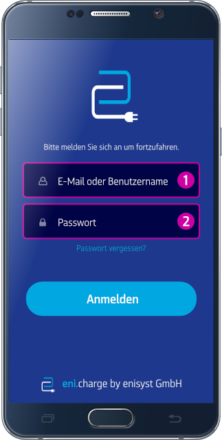 Nach der Appinstallation muss sich der Nutzer in der App anmelden, um die App nutzen zu können. Die Anmeldedaten werden von der enisyst GmbH bereitgestellt. Zur Anmeldung muss die E-Mail-Adresse (1) sowie das Passwort (2) eingetragen werden.