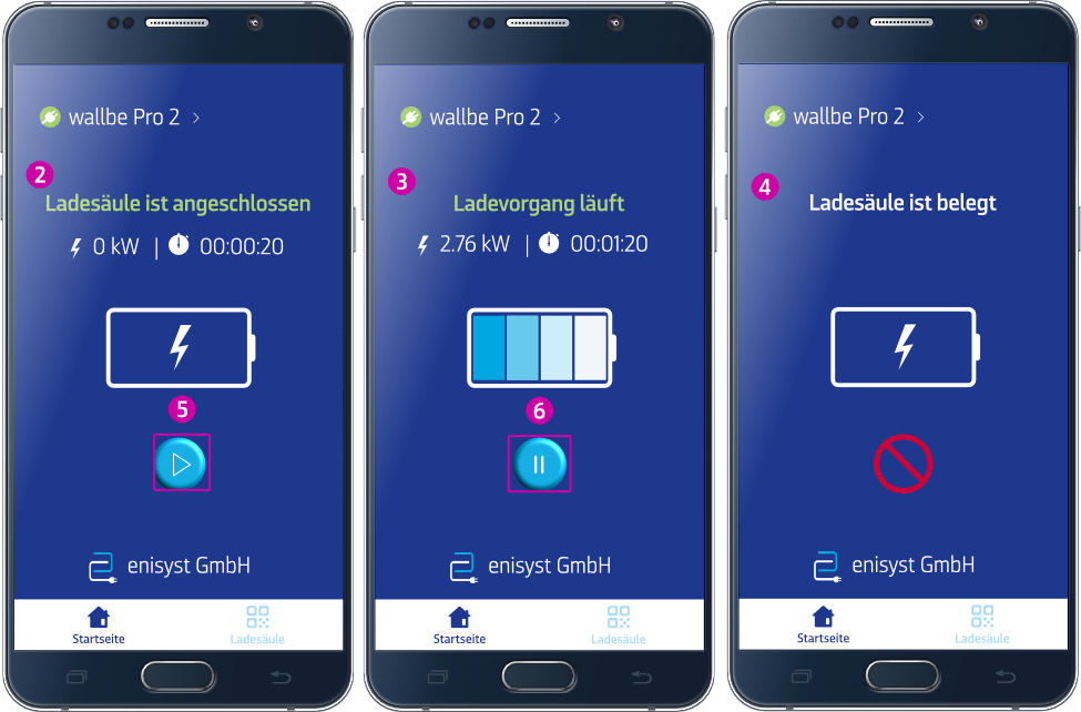Bevor ein Fahrzeug-Ladevorgang über den Play-Button (5) gestartet werden kann, muss ein Fahrzeug angeschlossen werden. Für jeden Ladevorgang wird die aktuelle Ladedauer und die bereits geladene Lademenge (Energie) angezeigt. Der Ladevorgang kann anschließend über den Pause-Button (6) wieder beendet werden.